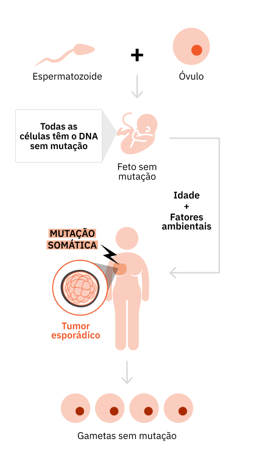 O câncer esporádico é aquele causado por várias mutações somáticas adquiridas ao longo da vida, durante o processo de envelhecimento e por exposição a fatores ambientais.