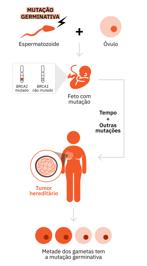 Como mutações germinativas estão presentes desde a formação do embrião, são encontradas em todas as células do indivíduo e podem ser passadas aos descendentes.