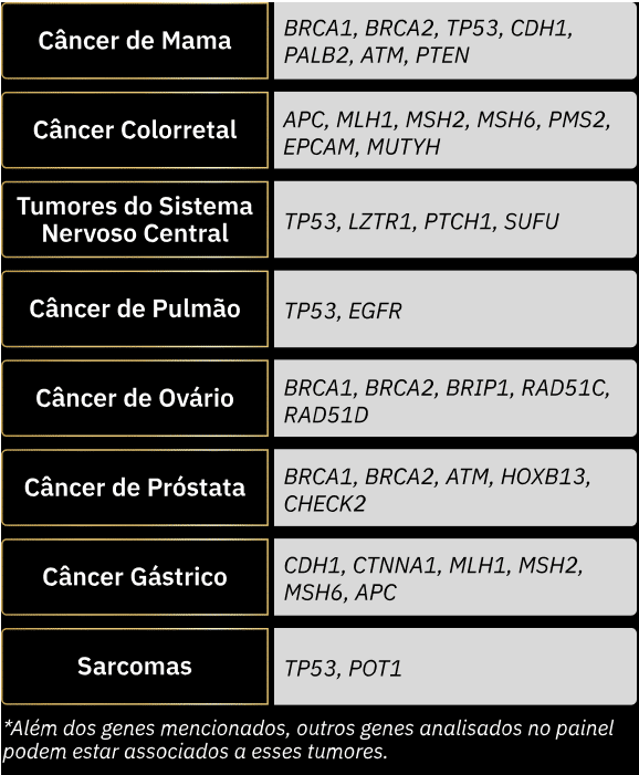 Análise de 100 genes que aumentam o risco de câncer hereditário. Identificar mutações nesses genes possibilita personalizar a vigilância e alguns tratamentos.